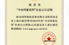 2017年12月29日,接到南京市企業(yè)信用管理協(xié)會(huì)通知,潤邦公司再次通過2016年度市級“守合同重信用”企業(yè)的認(rèn)定。誠信潤邦,傾心服務(wù)。潤邦始終把合同管理、信用